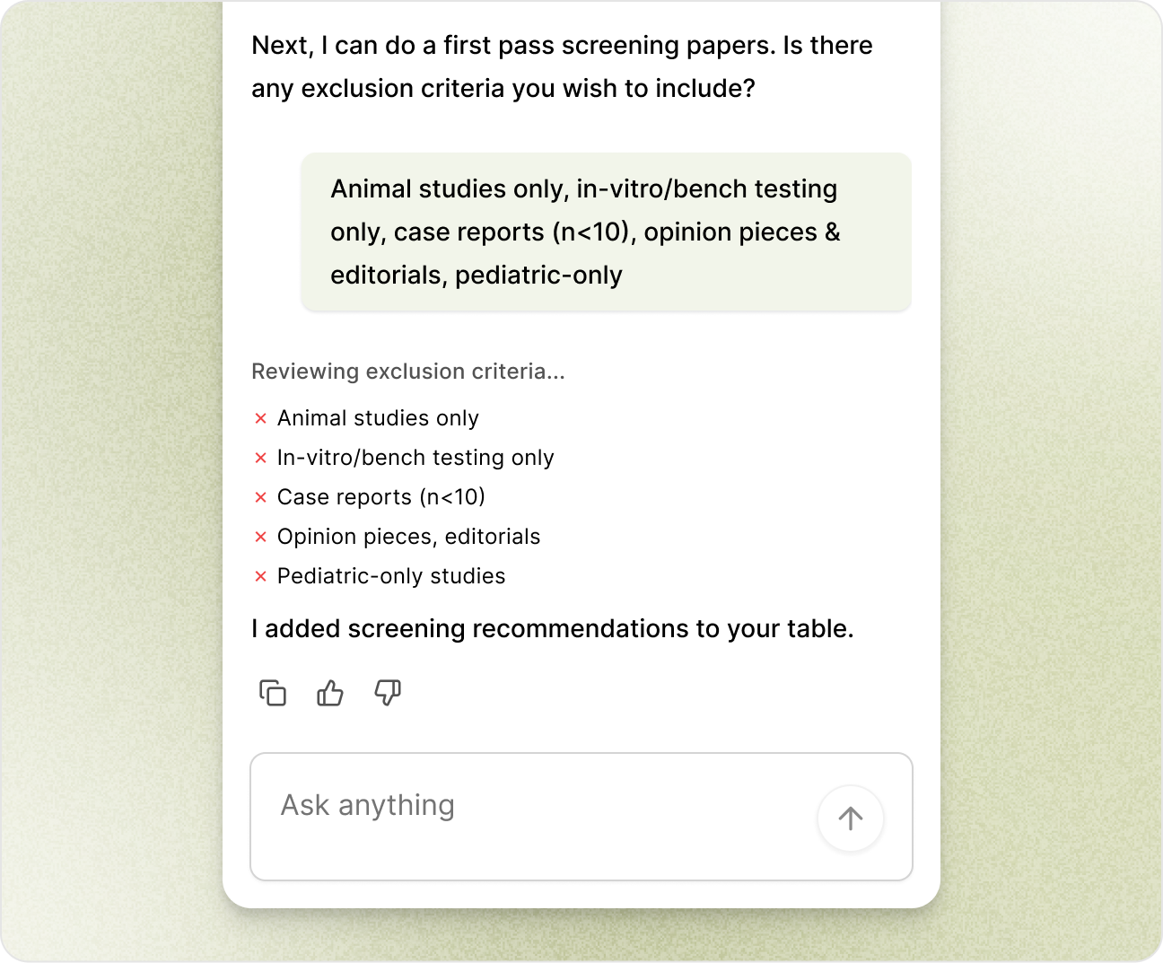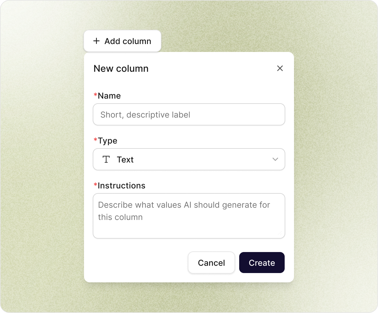 Use AI to extract, summarize, or compare specific criteria across long documents, instantly adding structured insights as new columns.