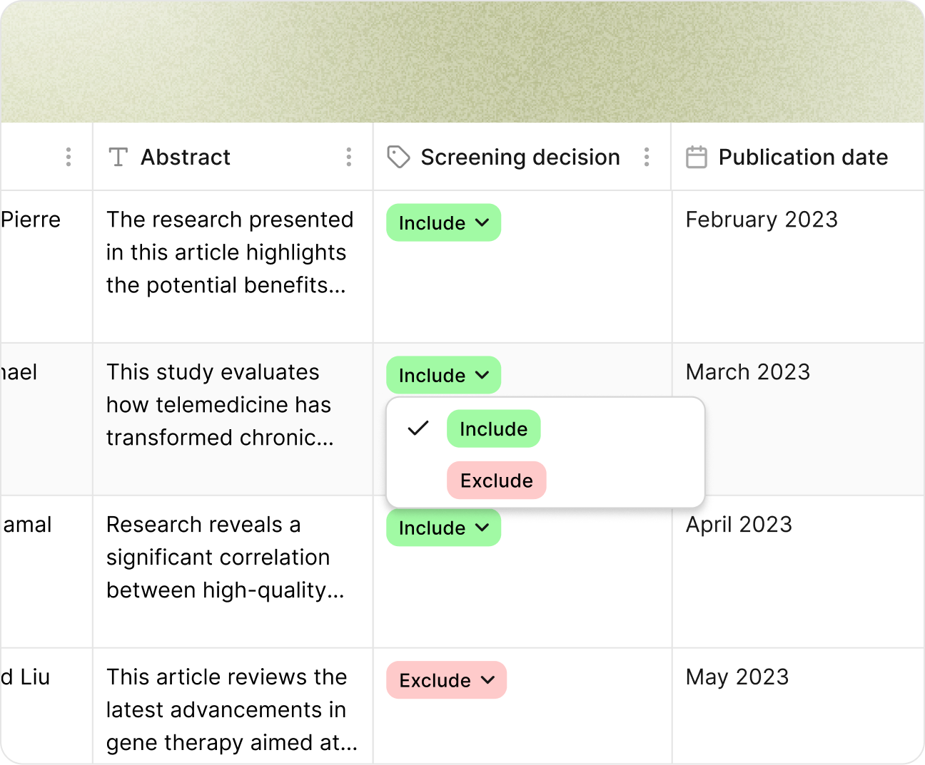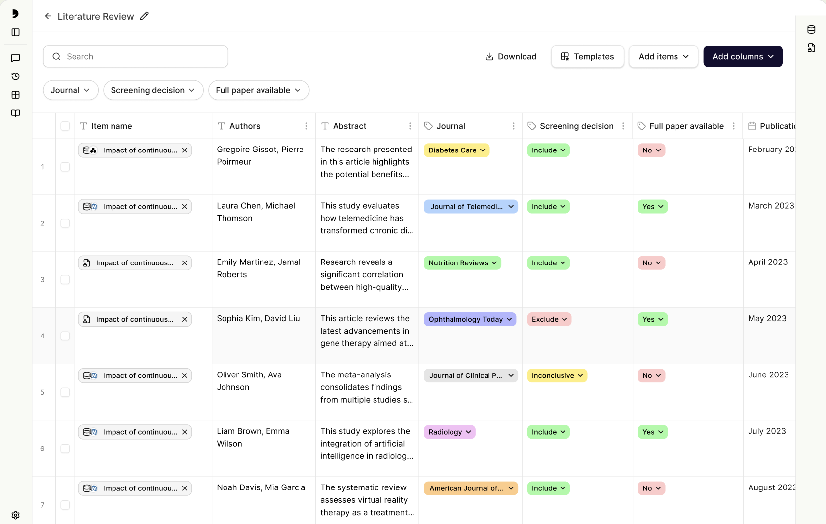 Start faster with proven table templates for workflows like comparable device analysis or literature review and adapt them to your needs.
