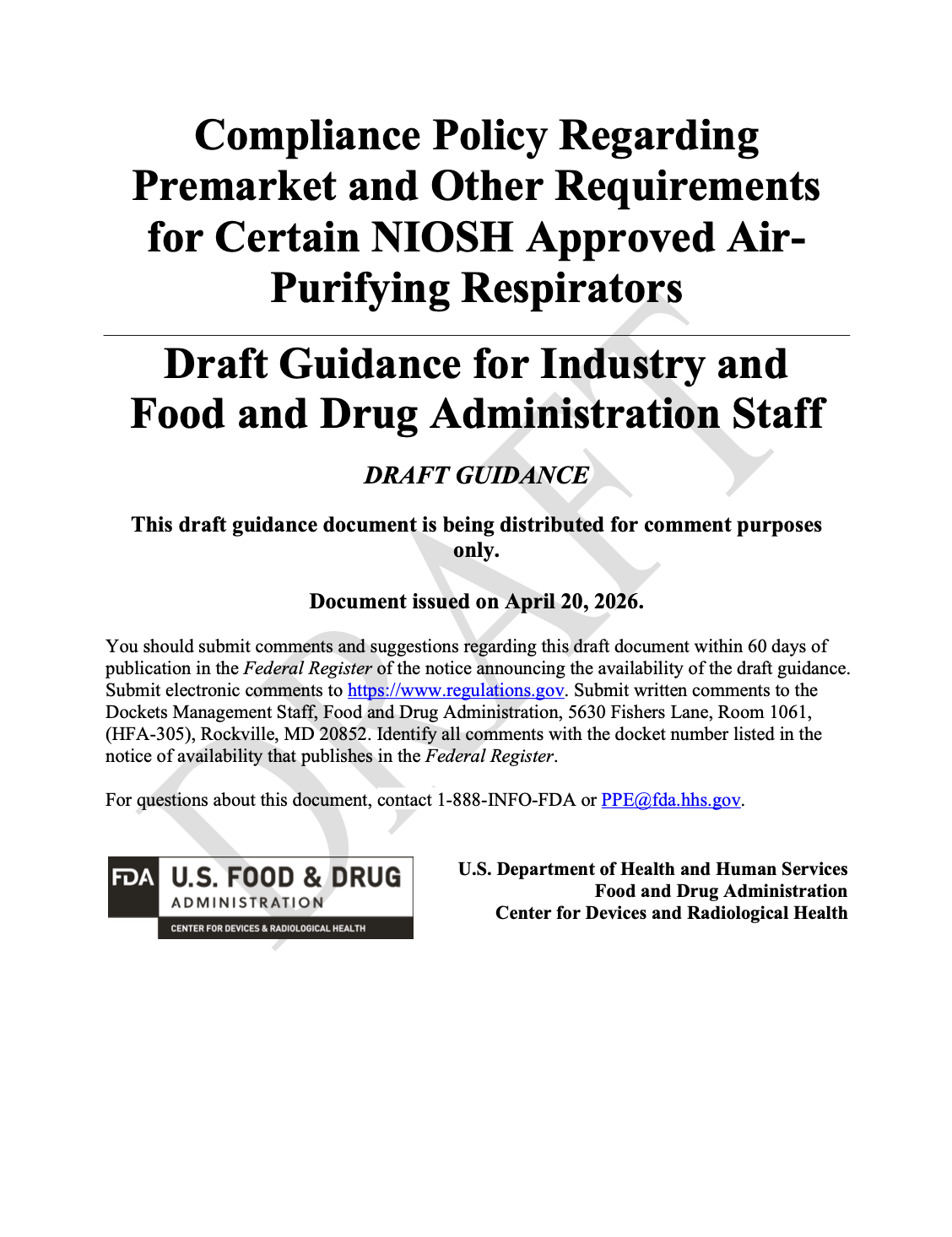 The new "Compliance Policy Regarding Premarket and Other Requirements for Certain NIOSH Approved Air-Purifying Respirators" (issued April 20, 2026) proposes that FDA will not prioritize enforcement of certain premarket and other FD&C Act requirements for NIOSH-approved respirators used in healthcare settings.