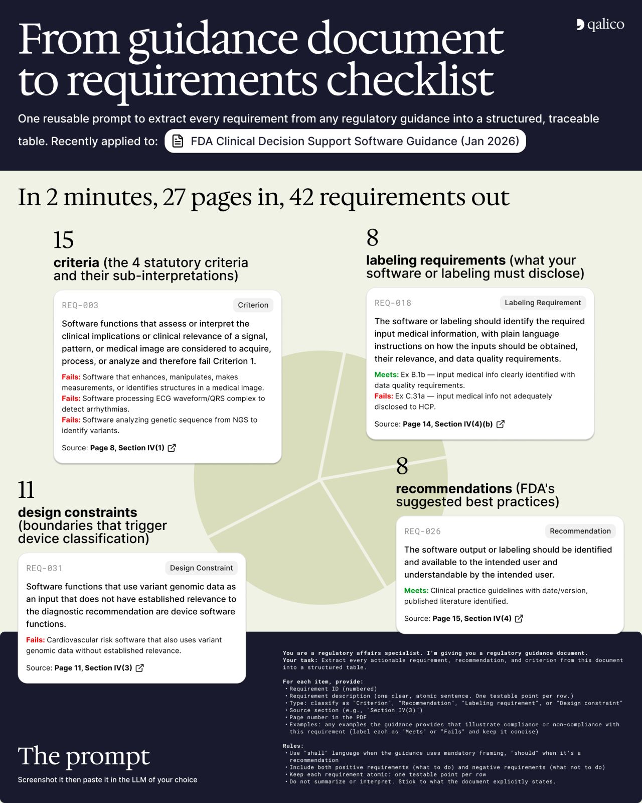 The prompt is reusable. We have run it on ISO standards, MDCG documents, and other FDA guidances, and the output always follows the same structure. This means gap analyses always start from a consistent format regardless of the source document.